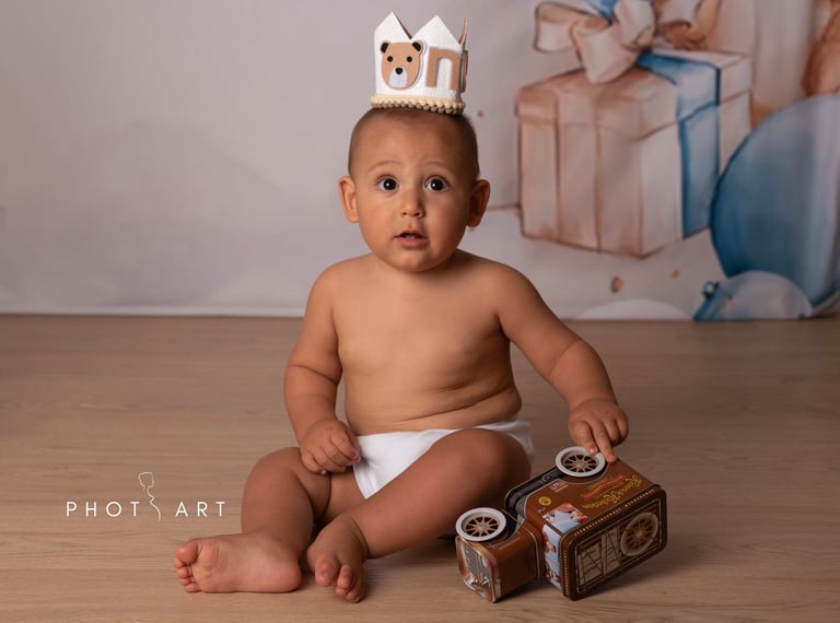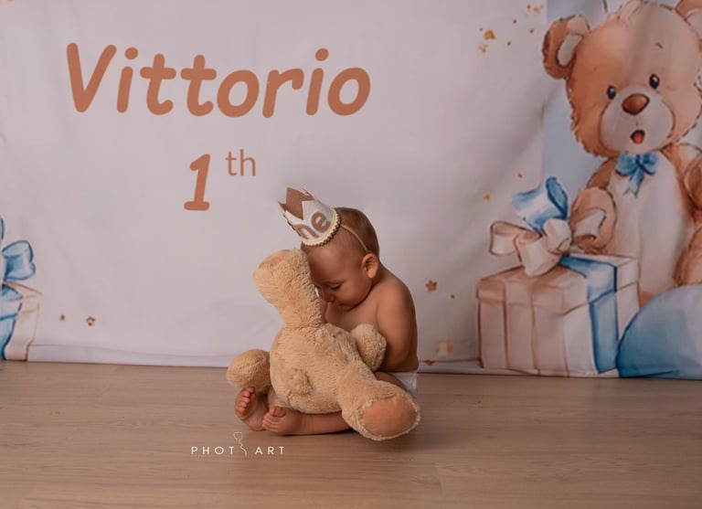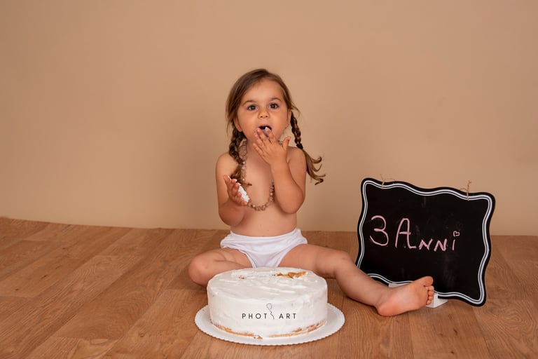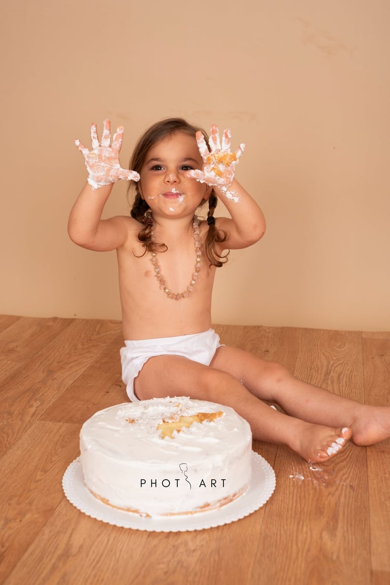 Il servizio Smash Cake è pensato come una vera festa di compleanno, con un set personalizzato insieme alla famiglia. La sessione inizia con uno shooting su un primo set, per scatti più puliti, e prosegue con il momento Smash, dove il bambino gioca e si diverte con la torta.